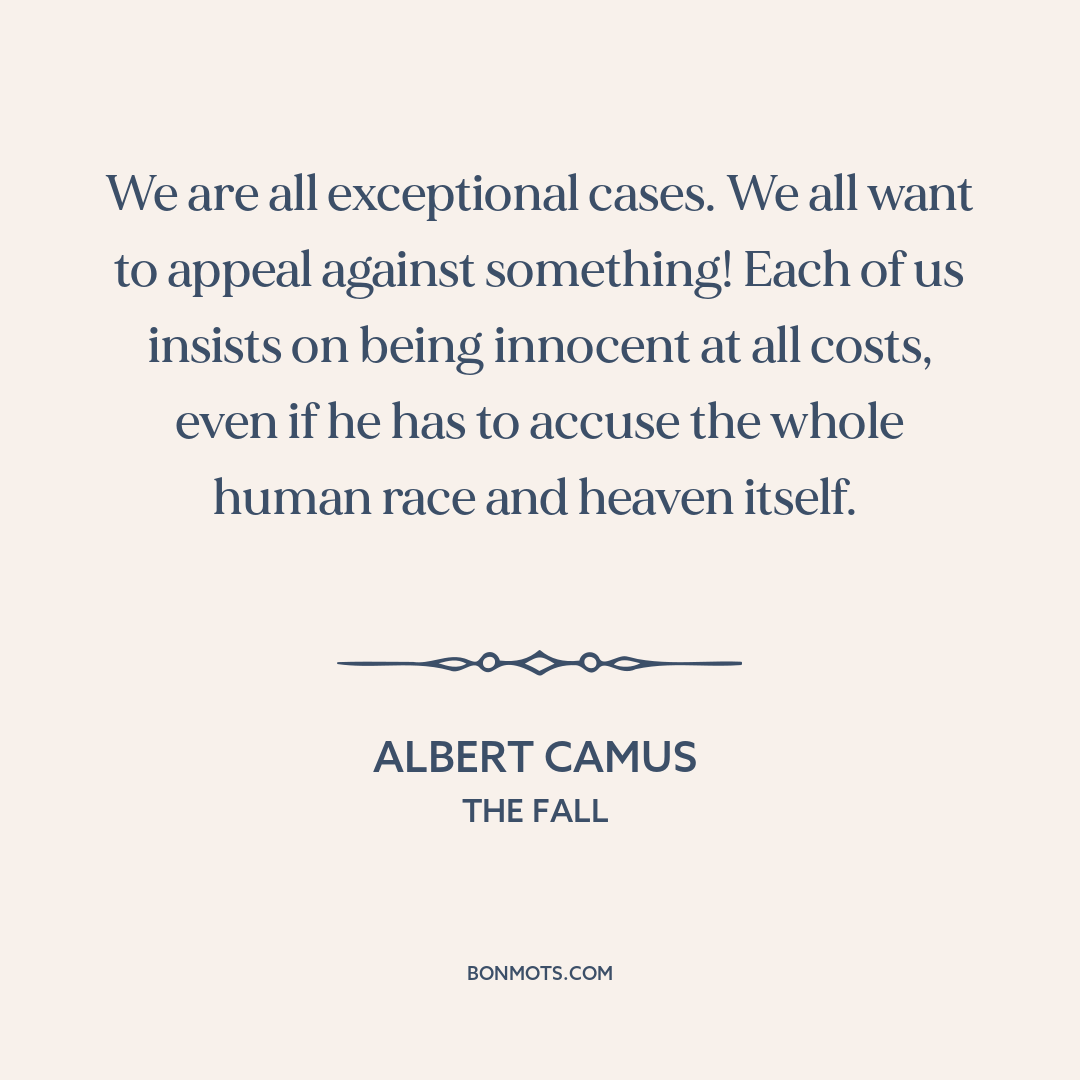 We are all exceptional cases. We all want to appeal against something! Each of us insists on being innocent at all costs, even if he has to accuse the whole human race and heaven itself.