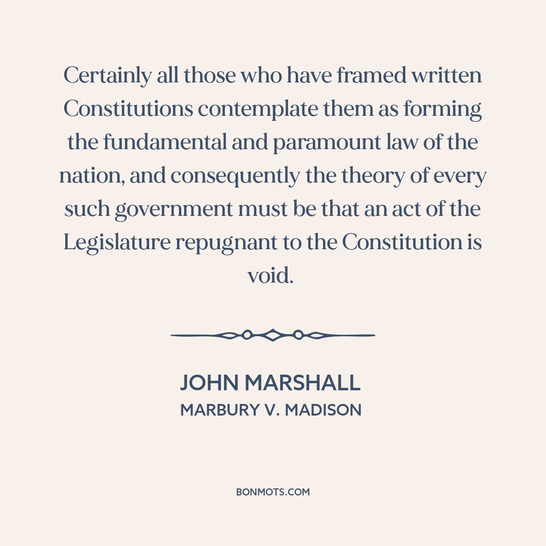 Certainly all those who have framed written Constitutions contemplate them as forming the fundamental and paramount law of the nation, and consequently the theory of every such government must be that an act of the Legislature repugnant to the Constitution is void.