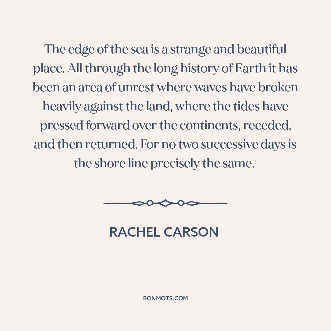 The edge of the sea is a strange and beautiful place. All through the long history of Earth it has been an area of unrest where waves have broken heavily against the land, where the tides have pressed forward over the continents, receded, and then returned. For no two successive days is the shore line precisely the same.