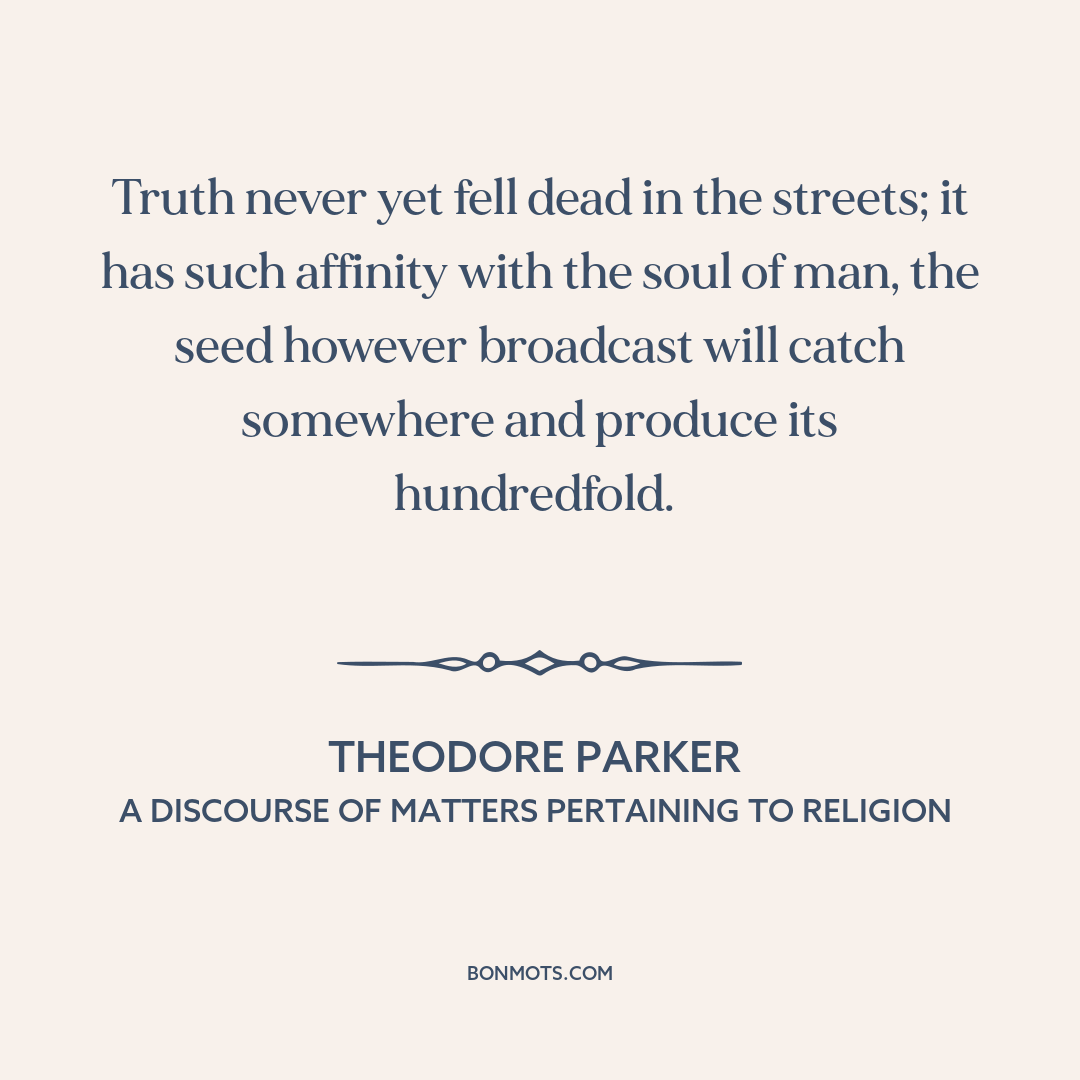 Truth never yet fell dead in the streets; it has such affinity with the soul of man, the seed however broadcast will catch somewhere and produce its hundredfold.