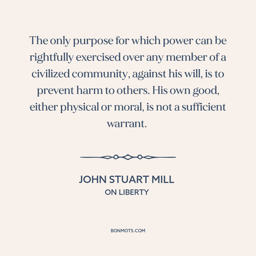 The only purpose for which power can be rightfully exercised over any member of a civilized community, against his will, is to prevent harm to others. His own good, either physical or moral, is not a sufficient warrant.