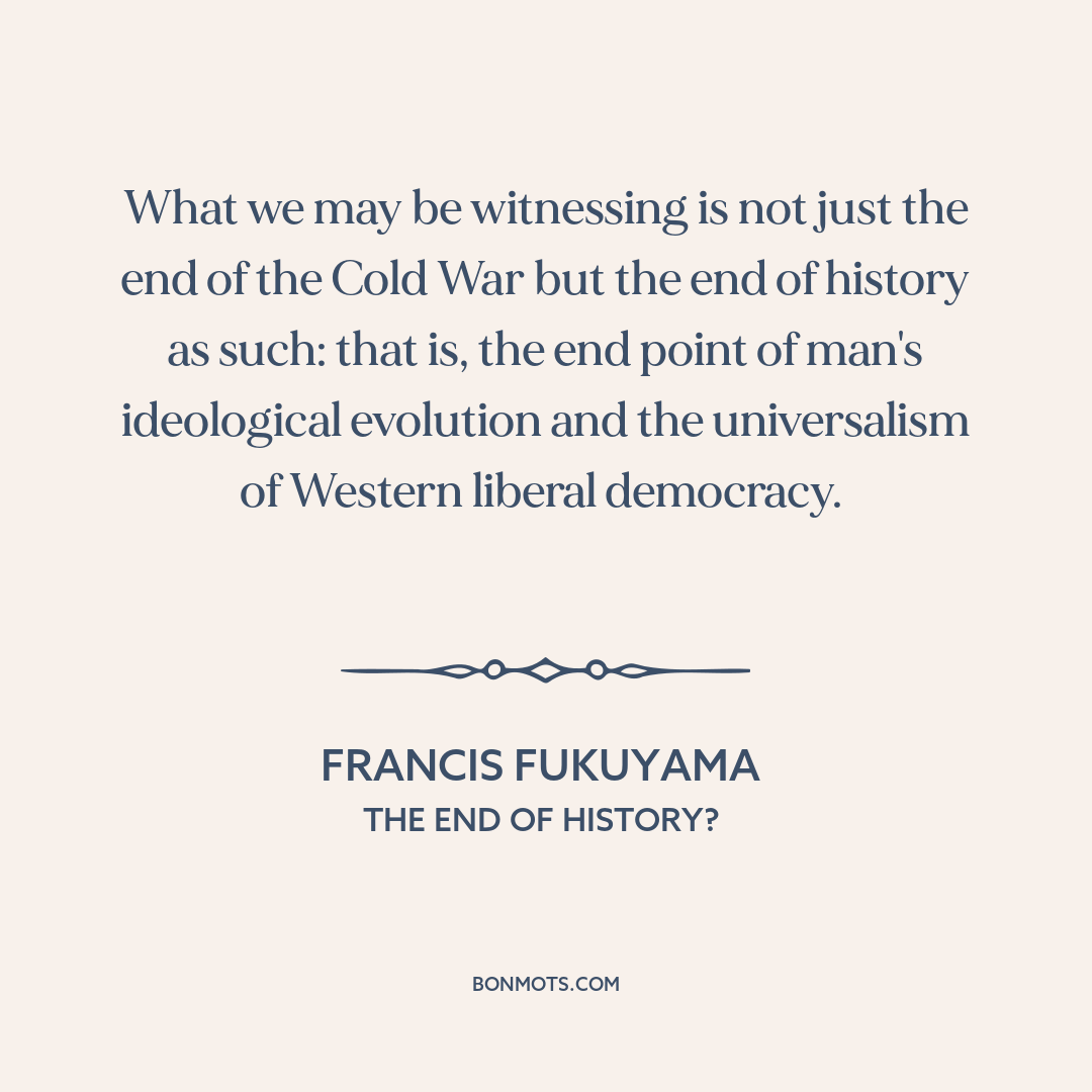 What we may be witnessing is not just the end of the Cold War but the end of history as such: that is, the end point of man's ideological evolution and the universalism of Western liberal democracy.