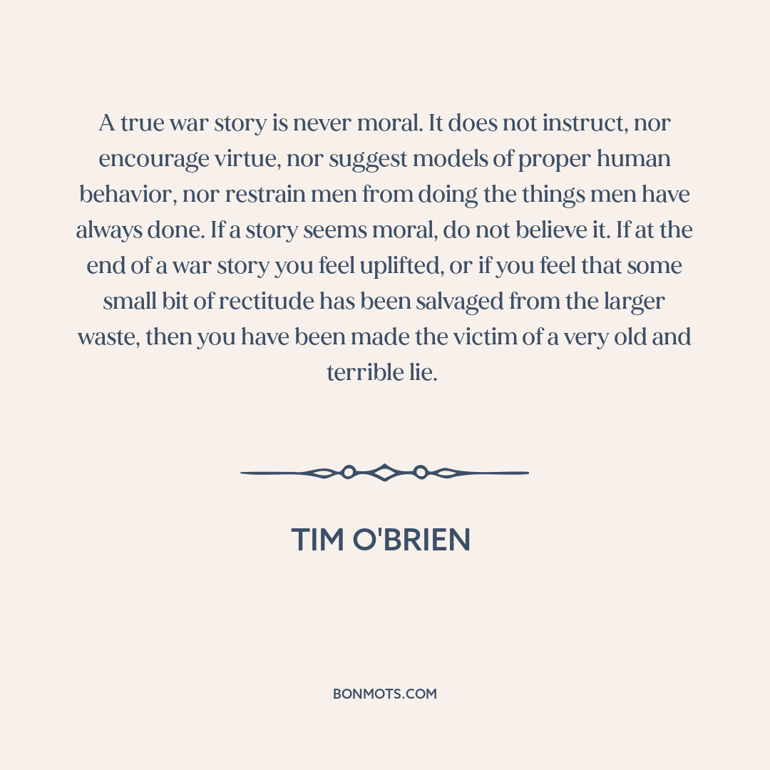 A true war story is never moral. It does not instruct, nor encourage virtue, nor suggest models of proper human behavior, nor restrain men from doing the things men have always done. If a story seems moral, do not believe it. If at the end of a war story you feel uplifted, or if you feel that some small bit of rectitude has been salvaged from the larger waste, then you have been made the victim of a very old and terrible lie.