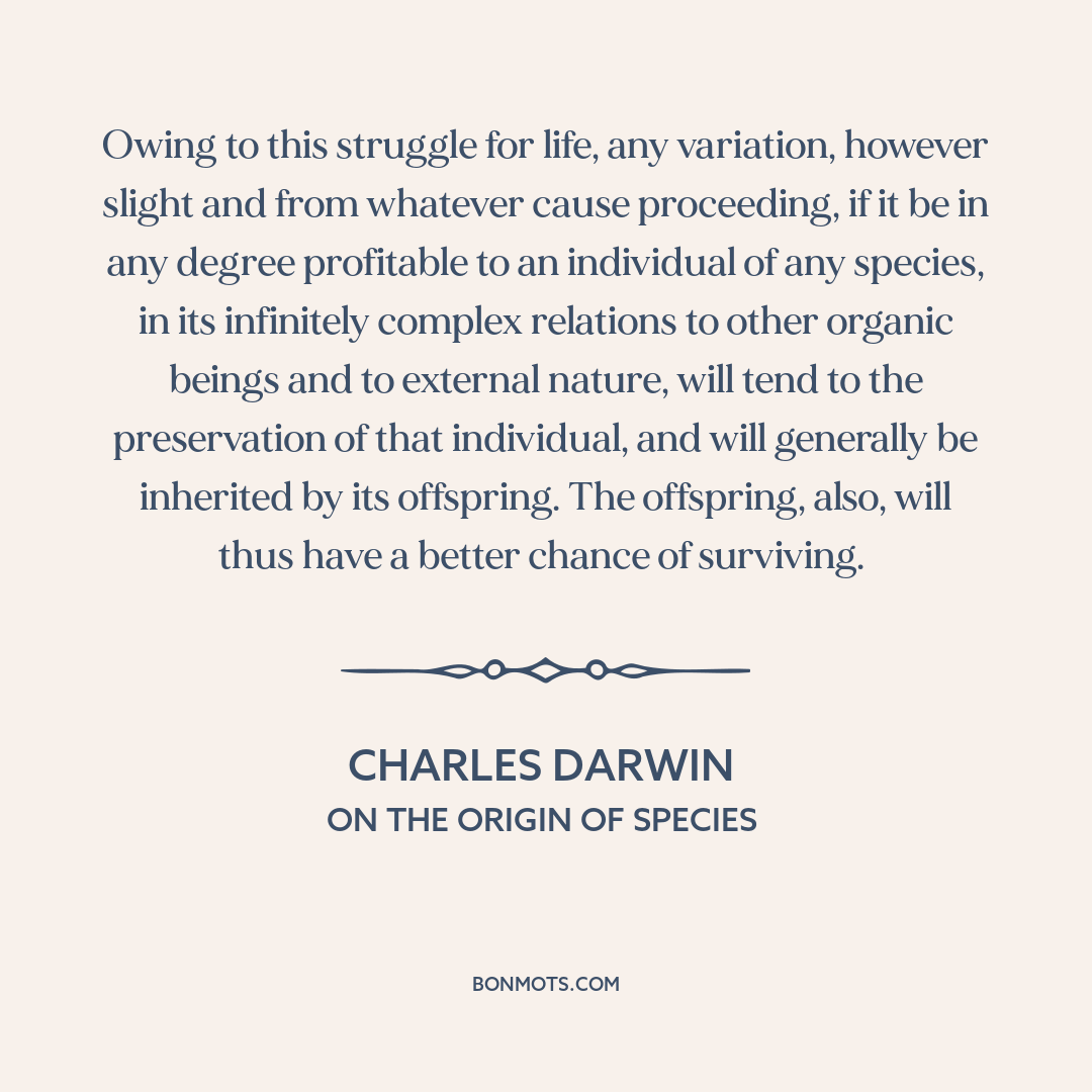 Owing to this struggle for life, any variation, however slight and from whatever cause proceeding, if it be in any degree profitable to an individual of any species, in its infinitely complex relations to other organic beings and to external nature, will tend to the preservation of that individual, and will generally be inherited by its offspring. The offspring, also, will thus have a better chance of surviving.