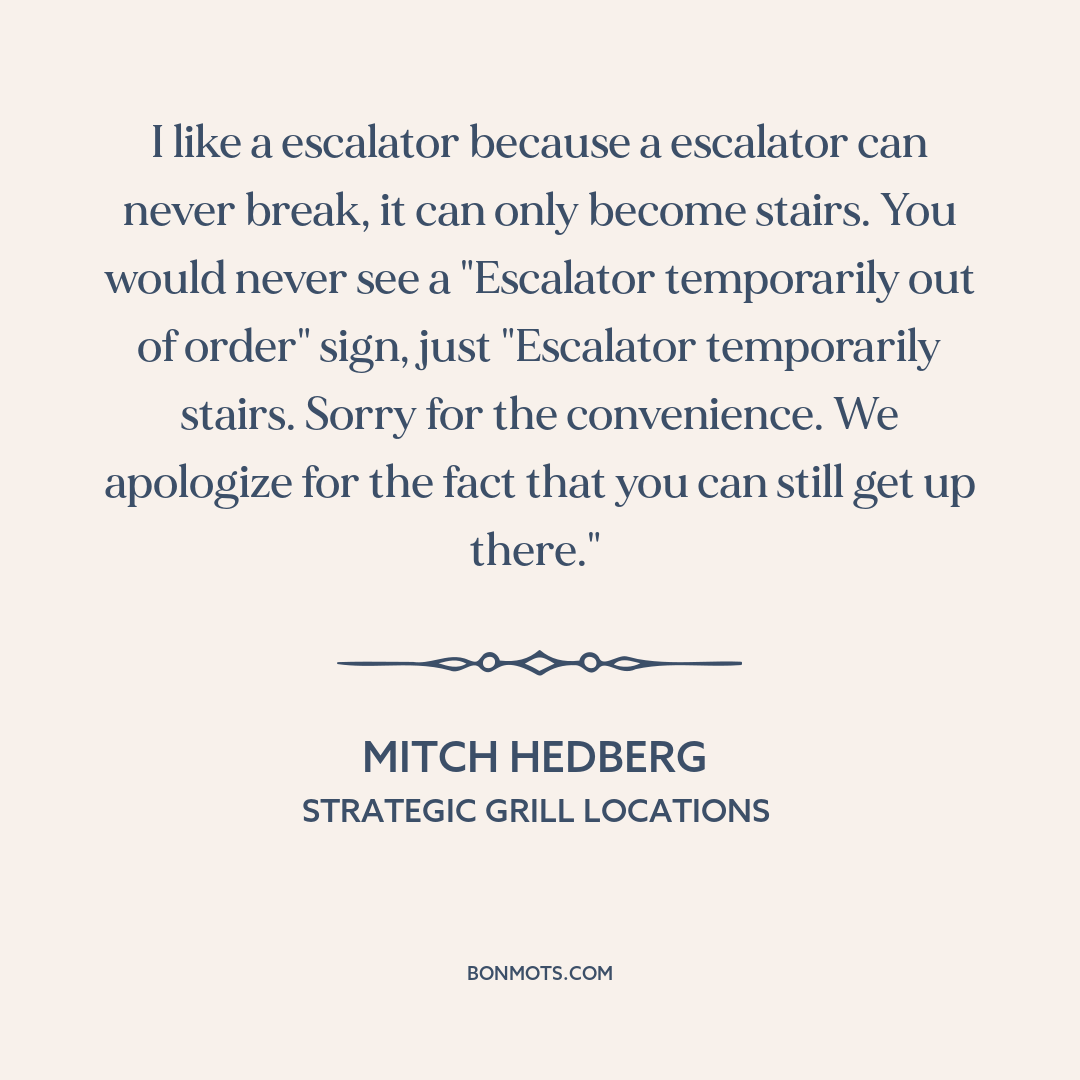 I like a escalator because a escalator can never break, it can only become stairs. You would never see a "Escalator temporarily out of order" sign, just "Escalator temporarily stairs. Sorry for the convenience. We apologize for the fact that you can still get up there."