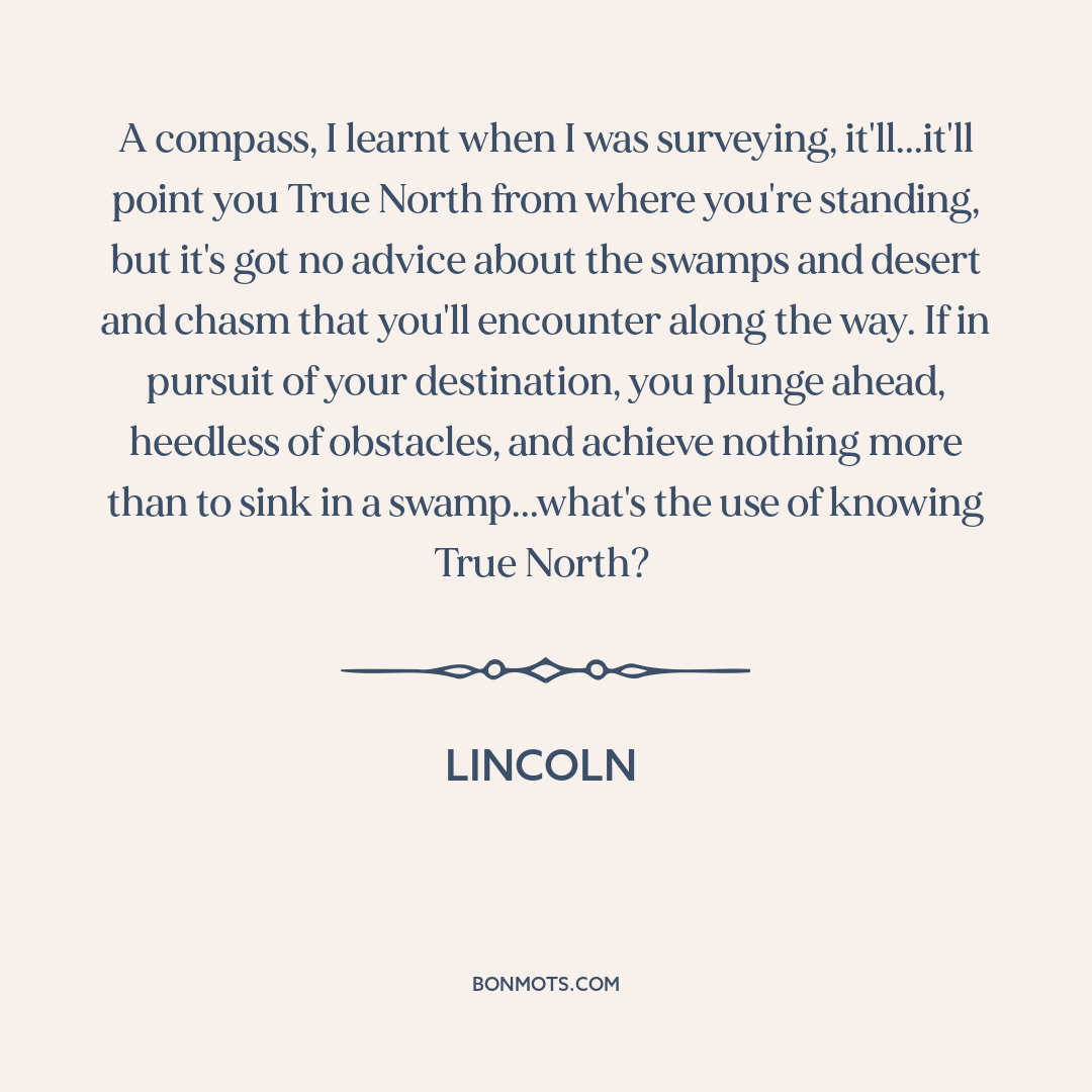 A compass, I learnt when I was surveying, it'll...it'll point you True North from where you're standing, but it's got no advice about the swamps and desert and chasm that you'll encounter along the way. If in pursuit of your destination, you plunge ahead, heedless of obstacles, and achieve nothing more than to sink in a swamp...what's the use of knowing True North?