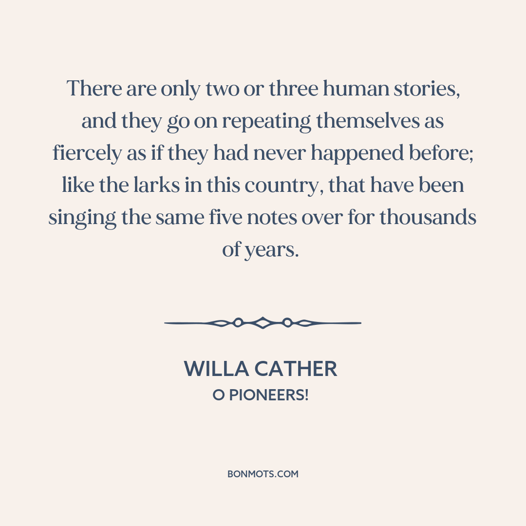 There are only two or three human stories, and they go on repeating themselves as fiercely as if they had never happened before; like the larks in this country, that have been singing the same five notes over for thousands of years.