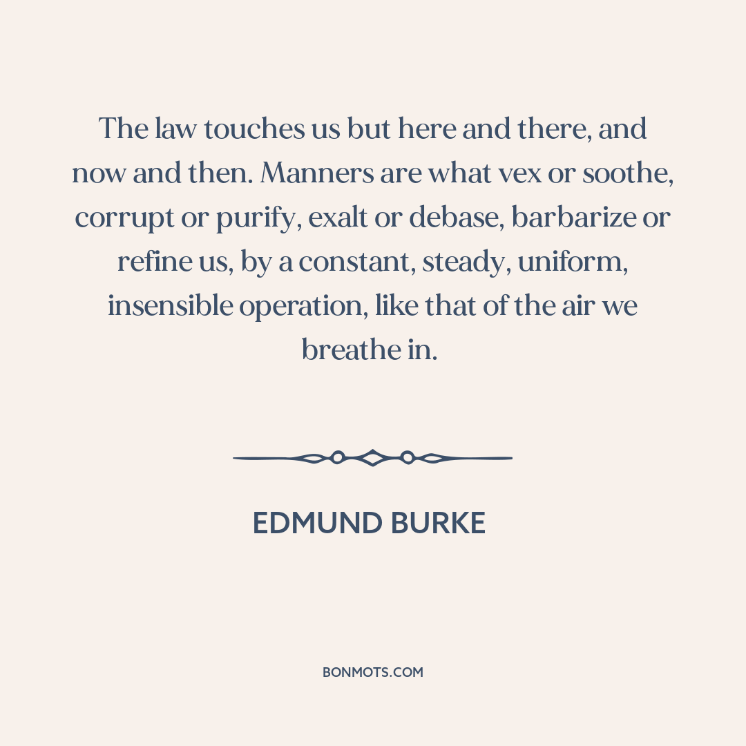 The law touches us but here and there, and now and then. Manners are what vex or soothe, corrupt or purify, exalt or debase, barbarize or refine us, by a constant, steady, uniform, insensible operation, like that of the air we breathe in.
