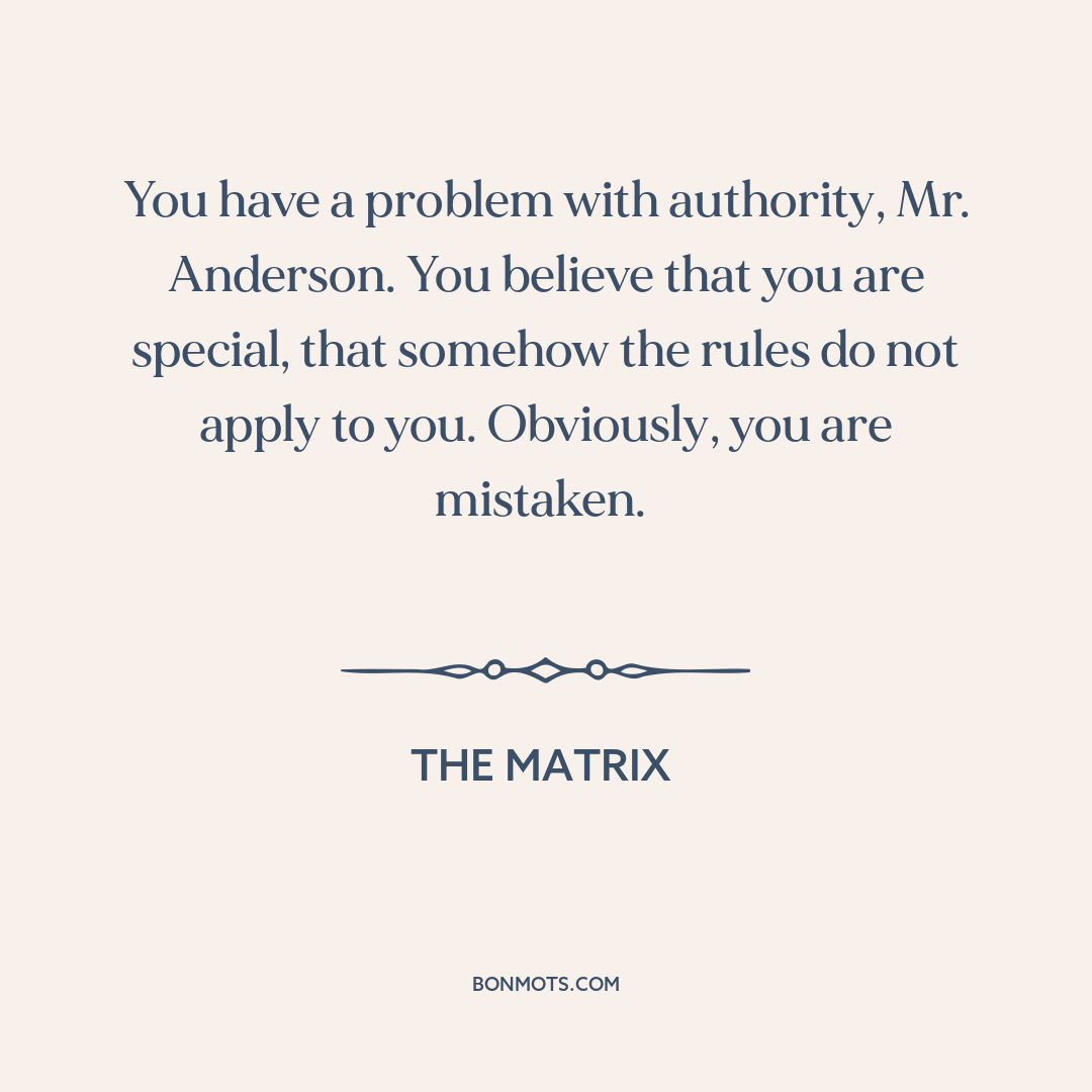 You have a problem with authority, Mr. Anderson. You believe that you are special, that somehow the rules do not apply to you. Obviously, you are mistaken.