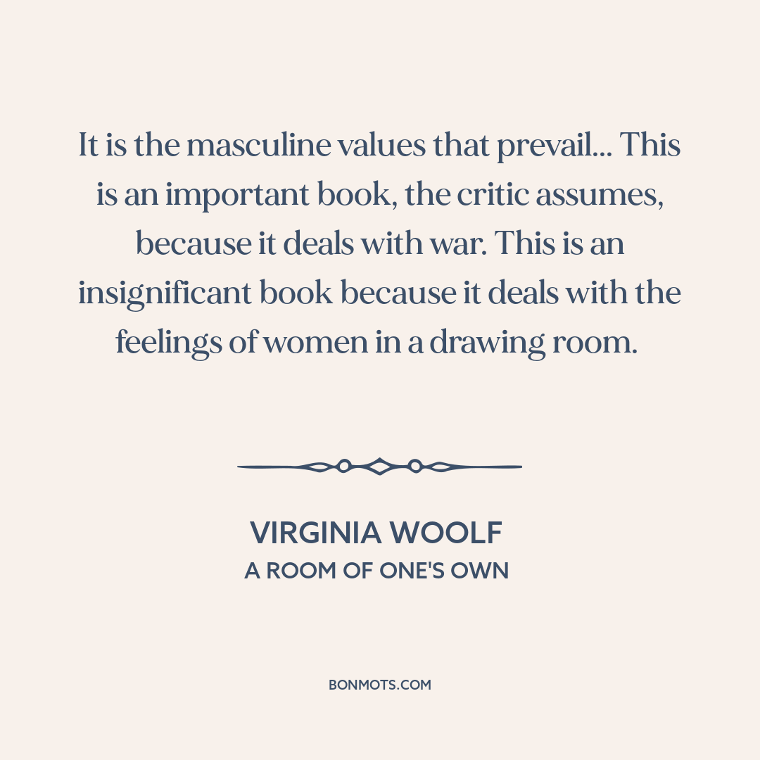 It is the masculine values that prevail... This is an important book, the critic assumes, because it deals with war. This is an insignificant book because it deals with the feelings of women in a drawing room.
