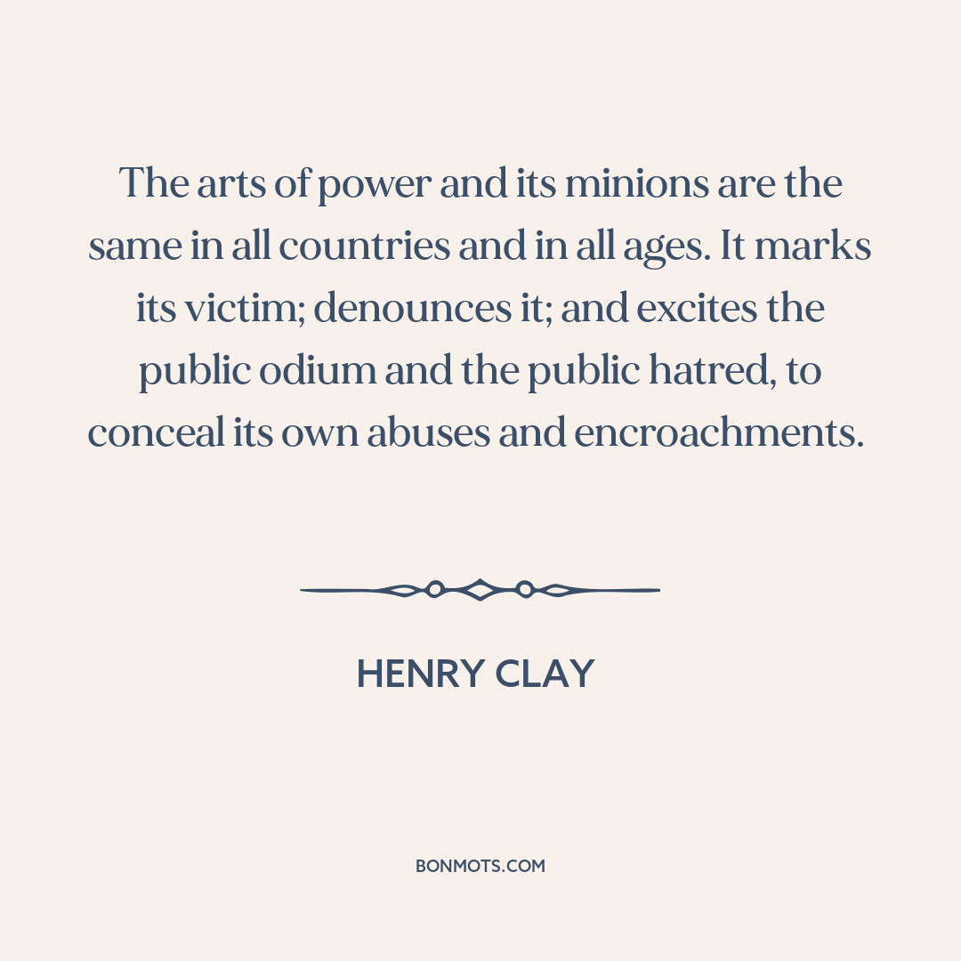 The arts of power and its minions are the same in all countries and in all ages. It marks its victim; denounces it; and excites the public odium and the public hatred, to conceal its own abuses and encroachments.