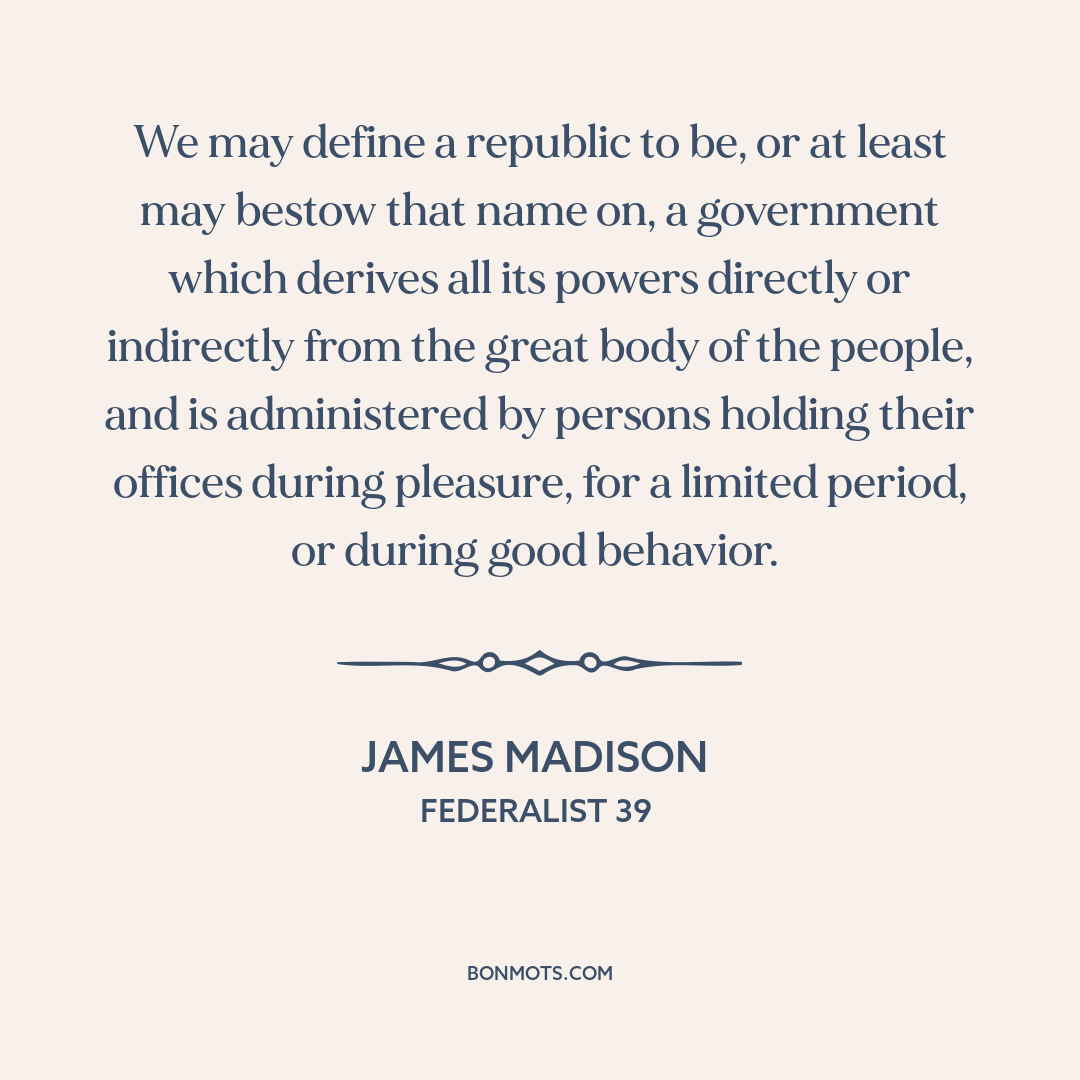 We may define a republic to be, or at least may bestow that name on, a government which derives all its powers directly or indirectly from the great body of the people, and is administered by persons holding their offices during pleasure, for a limited period, or during good behavior.