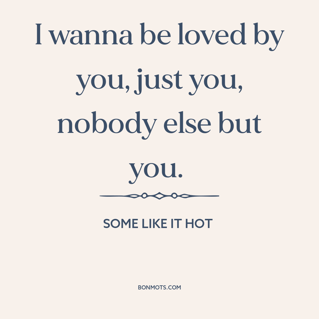 I wanna be loved by you, just you, nobody else but you. Some Like it Hot Watch Some Like it Hot at Amazon Watch Some Like it Hot at Amazon Instagram sharing coming soon. Quote text and source copied to clipboard. Link to this quote copied to clipboard. More information about this quote Topic Love Speaker Sugar Kane Kowalczyk Actor Marilyn Monroe Source Some Like it Hot Medium Film Genre Song Romantic comedy (film) Romantic comedy Language English Time 1959 1950s 20th century Authentication Score 3 More information on Authentication Score coming soon. Citation "I Wanna Be Loved By You." Some Like it Hot. Directed by Billy Wilder, The Mirisch Company, 1959. Citation text copied to clipboard.