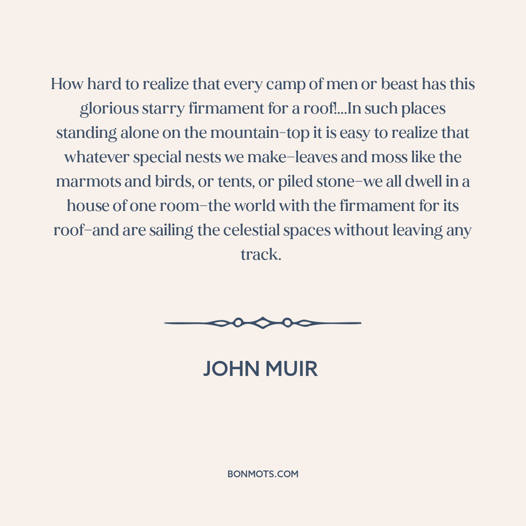 How hard to realize that every camp of men or beast has this glorious starry firmament for a roof!...In such places standing alone on the mountain-top it is easy to realize that whatever special nests we make—leaves and moss like the marmots and birds, or tents, or piled stone—we all dwell in a house of one room—the world with the firmament for its roof—and are sailing the celestial spaces without leaving any track.