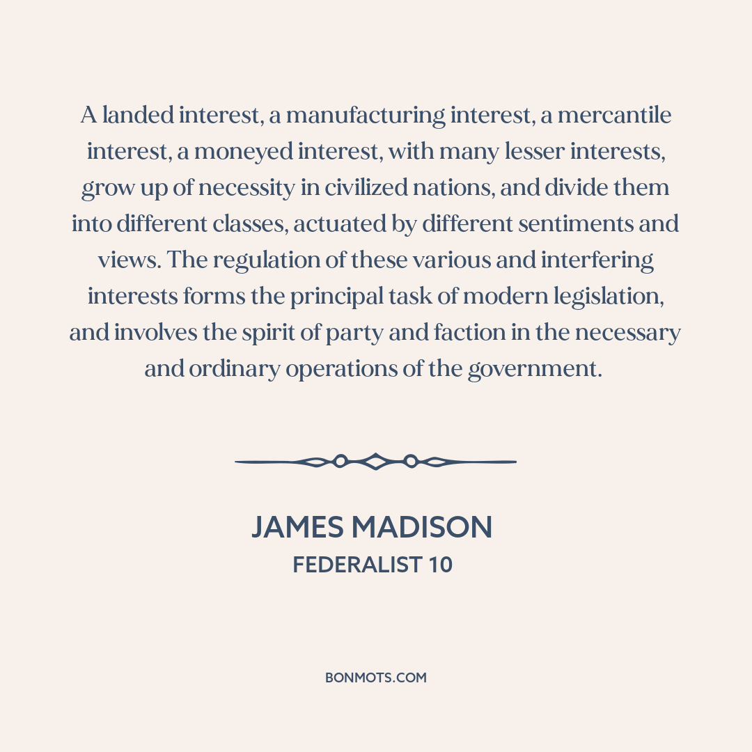 A landed interest, a manufacturing interest, a mercantile interest, a moneyed interest, with many lesser interests, grow up of necessity in civilized nations, and divide them into different classes, actuated by different sentiments and views. The regulation of these various and interfering interests forms the principal task of modern legislation, and involves the spirit of party and faction in the necessary and ordinary operations of the government.