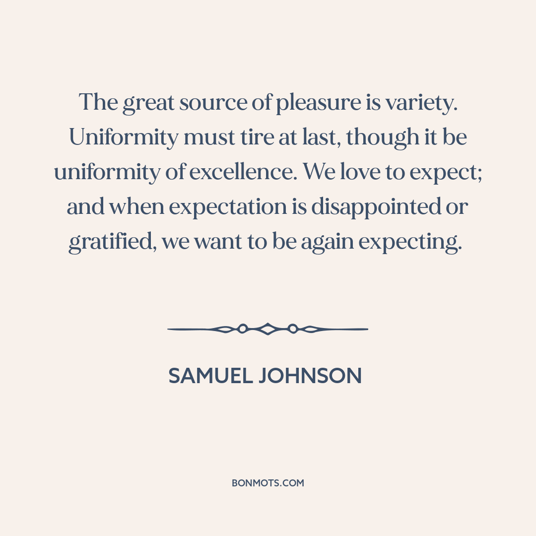 The great source of pleasure is variety. Uniformity must tire at last, though it be uniformity of excellence. We love to expect; and when expectation is disappointed or gratified, we want to be again expecting.