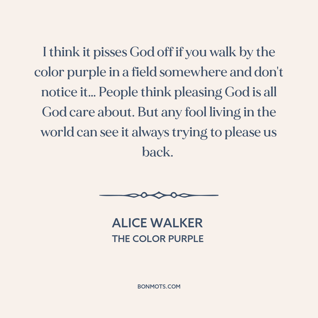 I think it pisses God off if you walk by the color purple in a field somewhere and don't notice it… People think pleasing God is all God care about. But any fool living in the world can see it always trying to please us back.