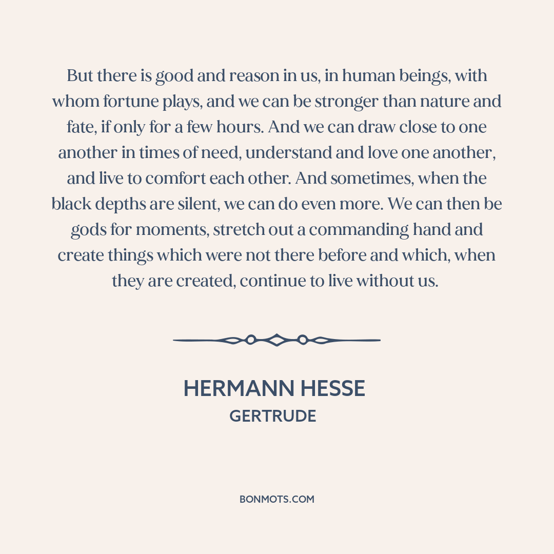 But there is good and reason in us, in human beings, with whom fortune plays, and we can be stronger than nature and fate, if only for a few hours. And we can draw close to one another in times of need, understand and love one another, and live to comfort each other. And sometimes, when the black depths are silent, we can do even more. We can then be gods for moments, stretch out a commanding hand and create things which were not there before and which, when they are created, continue to live without us.