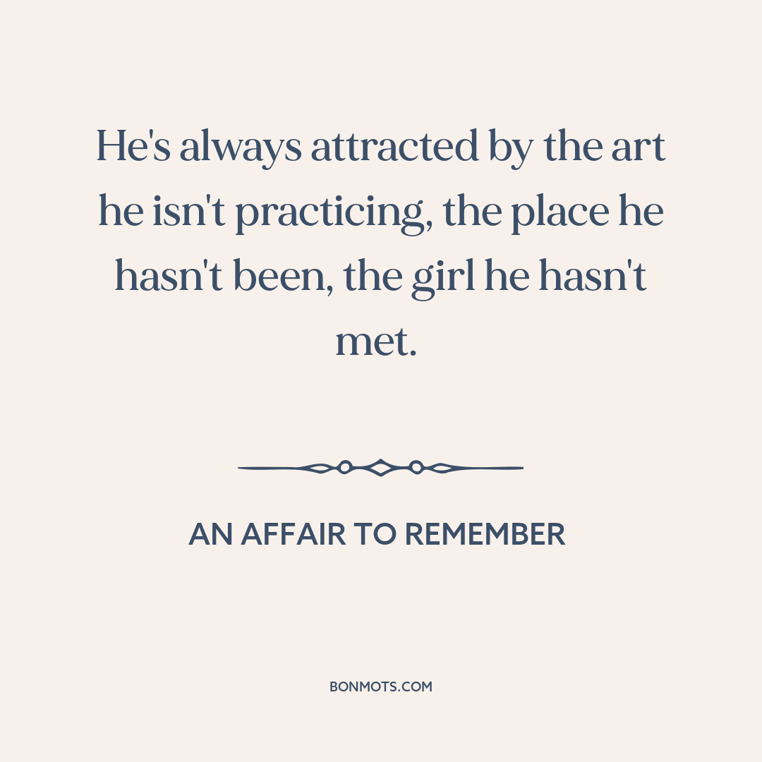 He's always attracted by the art he isn't practicing, the place he hasn't been, the girl he hasn't met.