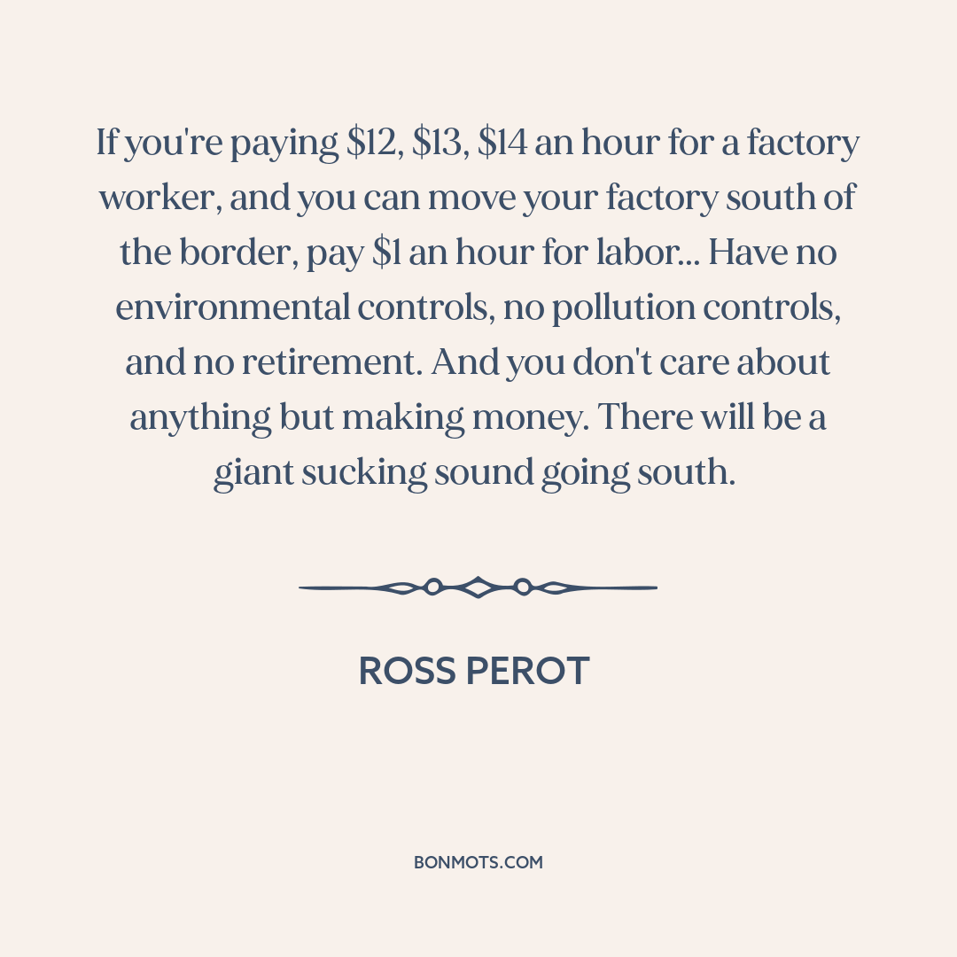 If you're paying $12, $13, $14 an hour for a factory worker, and you can move your factory south of the border, pay $1 an hour for labor... Have no environmental controls, no pollution controls, and no retirement. And you don't care about anything but making money. There will be a giant sucking sound going south.