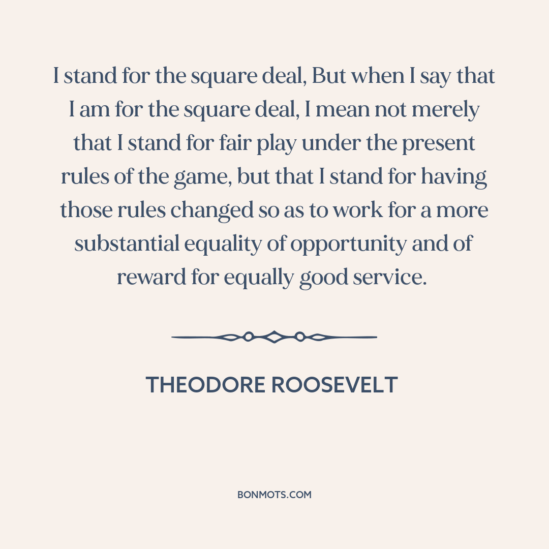 I stand for the square deal, But when I say that I am for the square deal, I mean not merely that I stand for fair play under the present rules of the game, but that I stand for having those rules changed so as to work for a more substantial equality of opportunity and of reward for equally good service.