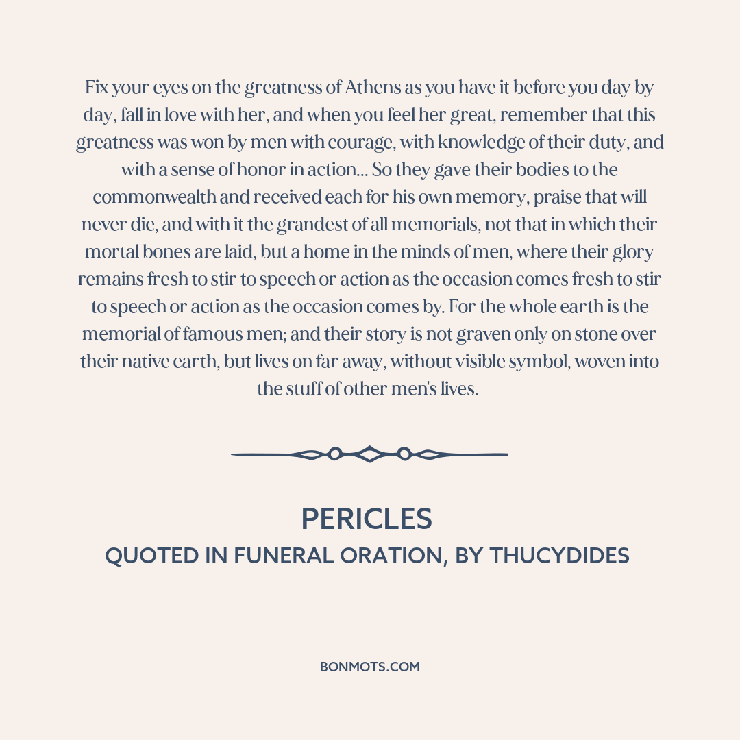 Fix your eyes on the greatness of Athens as you have it before you day by day, fall in love with her, and when you feel her great, remember that this greatness was won by men with courage, with knowledge of their duty, and with a sense of honor in action... So they gave their bodies to the commonwealth and received each for his own memory, praise that will never die, and with it the grandest of all memorials, not that in which their mortal bones are laid, but a home in the minds of men, where their glory remains fresh to stir to speech or action as the occasion comes fresh to stir to speech or action as the occasion comes by. For the whole earth is the memorial of famous men; and their story is not graven only on stone over their native earth, but lives on far away, without visible symbol, woven into the stuff of other men's lives.