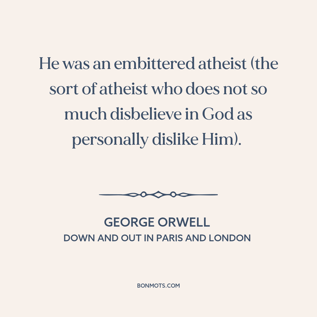 He was an embittered atheist (the sort of atheist who does not so much disbelieve in God as personally dislike Him).
