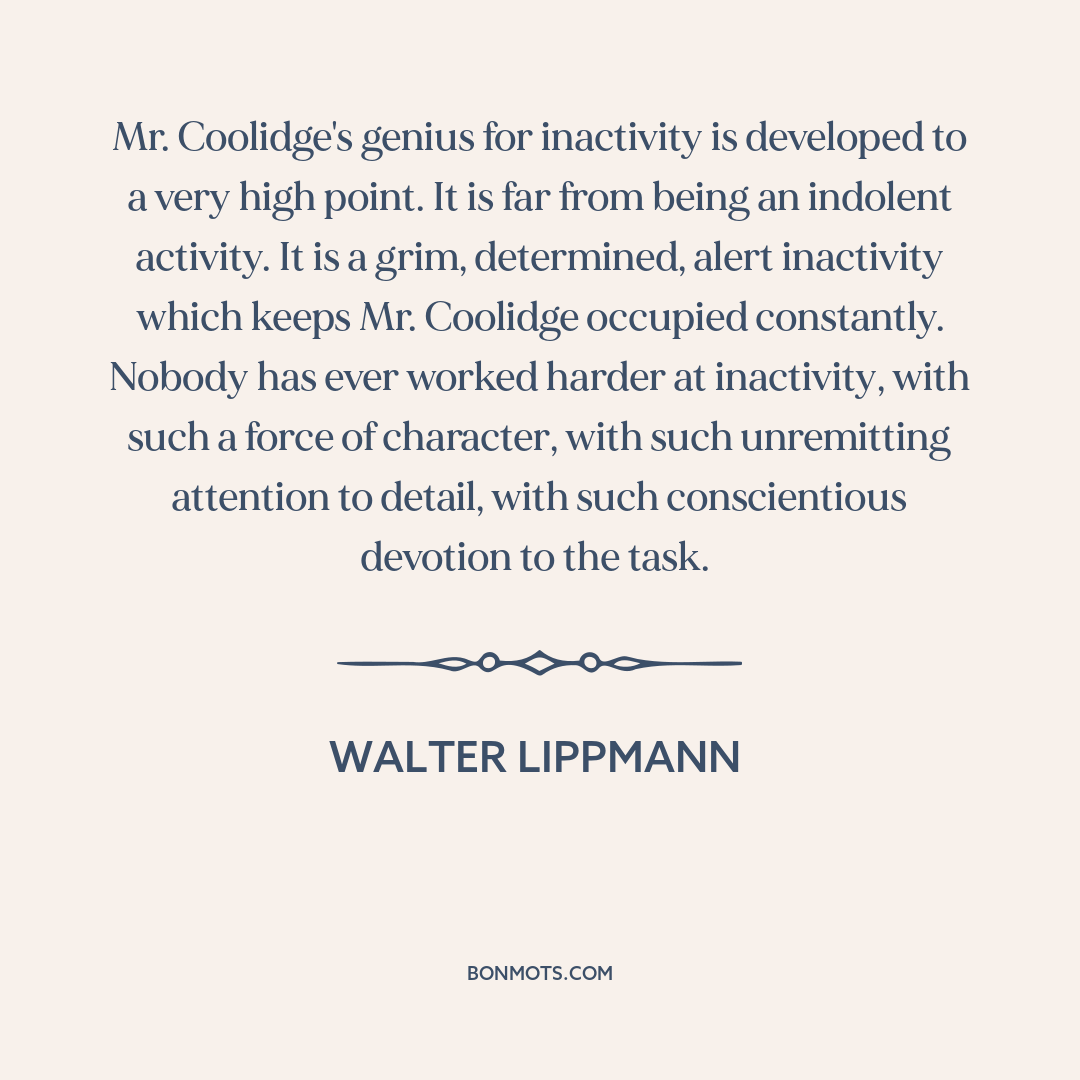 Mr. Coolidge's genius for inactivity is developed to a very high point. It is far from being an indolent activity. It is a grim, determined, alert inactivity which keeps Mr. Coolidge occupied constantly. Nobody has ever worked harder at inactivity, with such a force of character, with such unremitting attention to detail, with such conscientious devotion to the task.