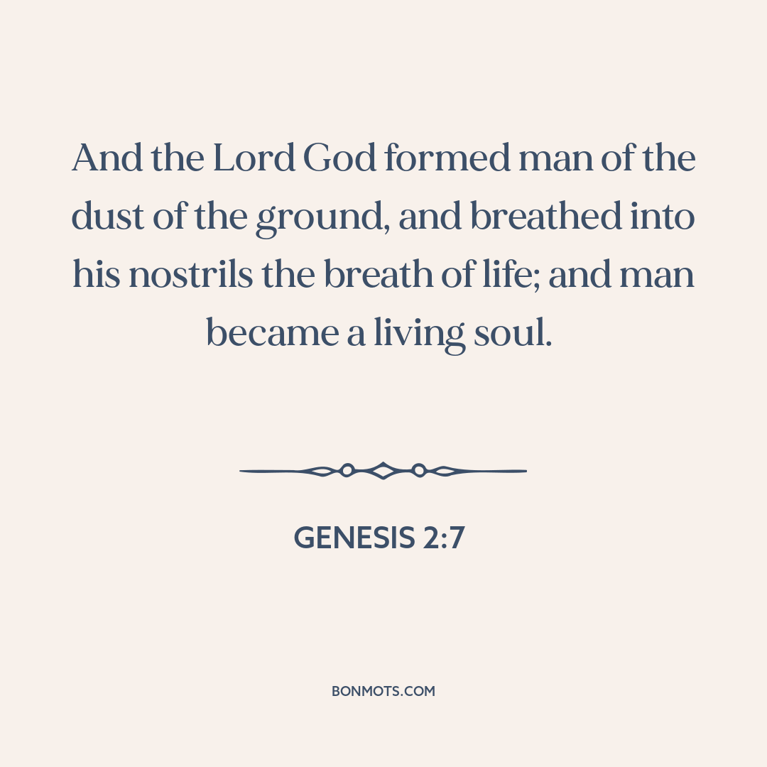 וַיִּיצֶר֩ יְהוָ֨ה אֱלֹהִ֜ים אֶת־הָֽאָדָ֗ם עָפָר֙ מִן־הָ֣אֲדָמָ֔ה וַיִּפַּ֥ח בְּאַפָּ֖יו נִשְׁמַ֣ת חַיִּ֑ים וַֽיְהִ֥י הָֽאָדָ֖ם לְנֶ֥פֶשׁ חַיָּֽה׃