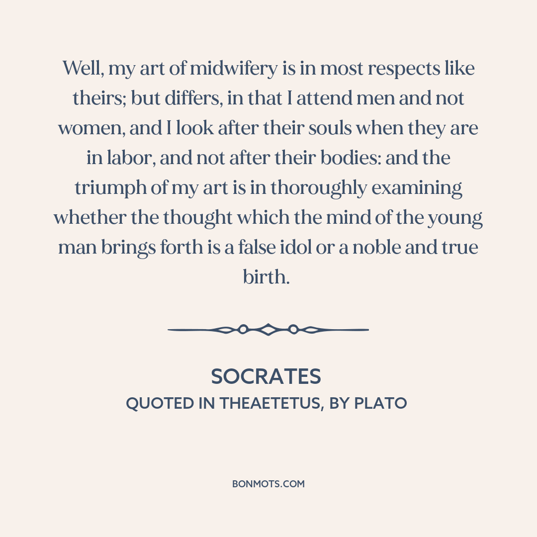 Well, my art of midwifery is in most respects like theirs; but differs, in that I attend men and not women, and I look after their souls when they are in labor, and not after their bodies: and the triumph of my art is in thoroughly examining whether the thought which the mind of the young man brings forth is a false idol or a noble and true birth.