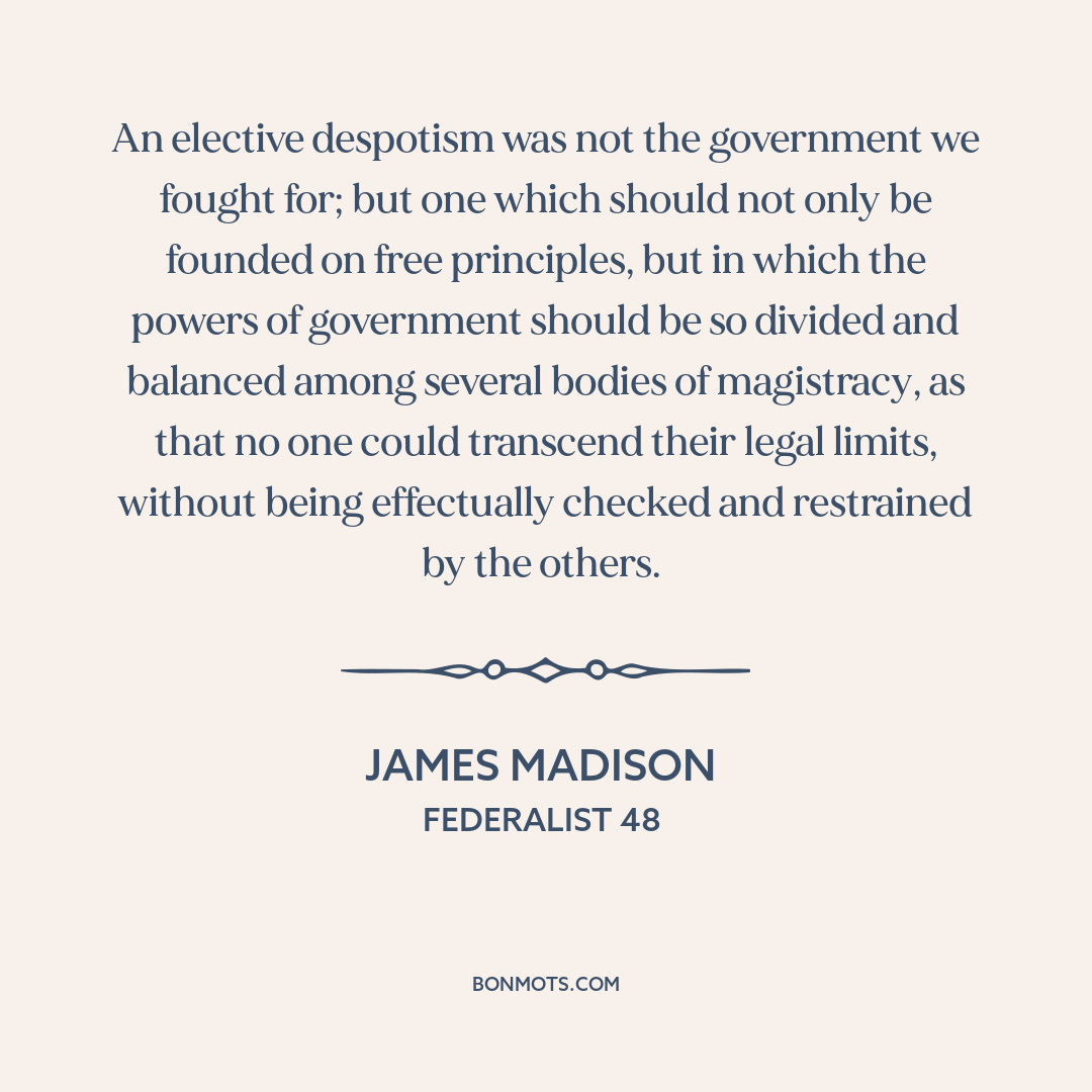 An elective despotism was not the government we fought for; but one which should not only be founded on free principles, but in which the powers of government should be so divided and balanced among several bodies of magistracy, as that no one could transcend their legal limits, without being effectually checked and restrained by the others.