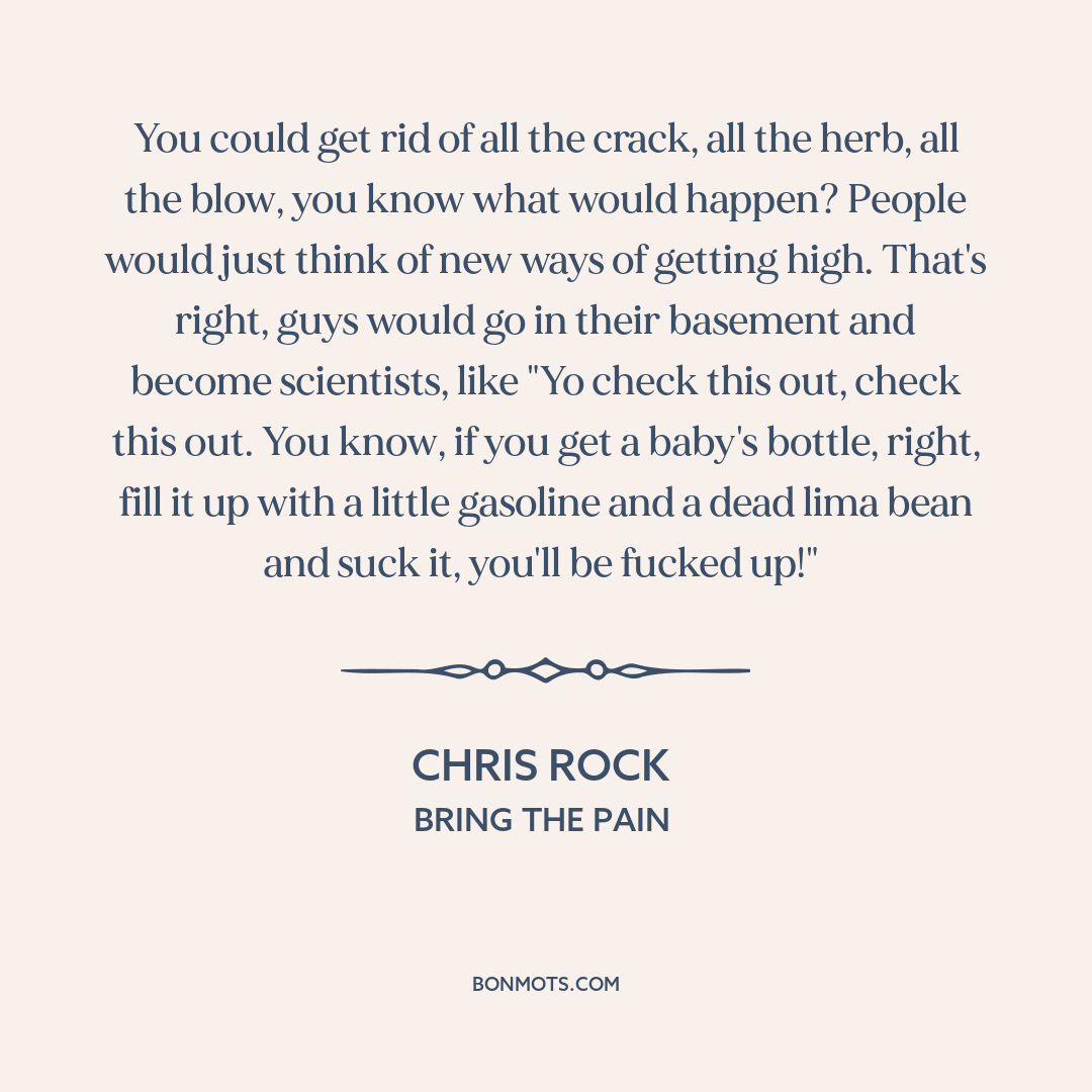You could get rid of all the crack, all the herb, all the blow, you know what would happen? People would just think of new ways of getting high. That's right, guys would go in their basement and become scientists, like "Yo check this out, check this out. You know, if you get a baby's bottle, right, fill it up with a little gasoline and a dead lima bean and suck it, you'll be fucked up!"