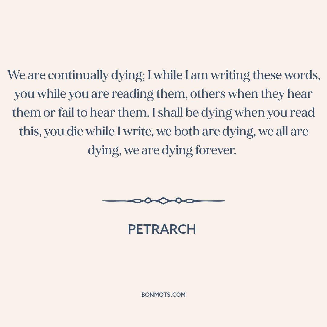We are continually dying; I while I am writing these words, you while you are reading them, others when they hear them or fail to hear them. I shall be dying when you read this, you die while I write, we both are dying, we all are dying, we are dying forever.