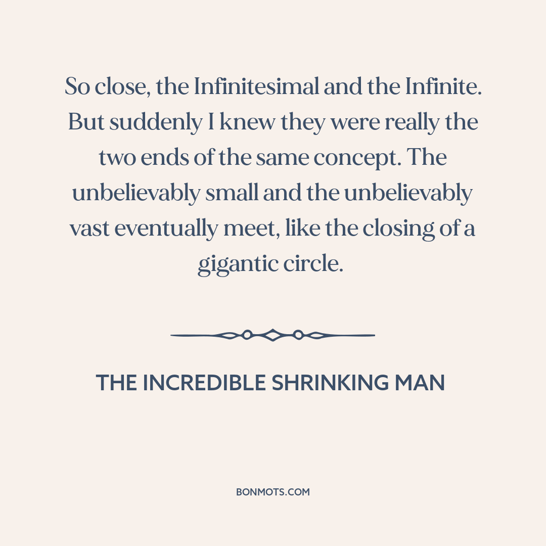 So close, the Infinitesimal and the Infinite. But suddenly I knew they were really the two ends of the same concept. The unbelievably small and the unbelievably vast eventually meet, like the closing of a gigantic circle.