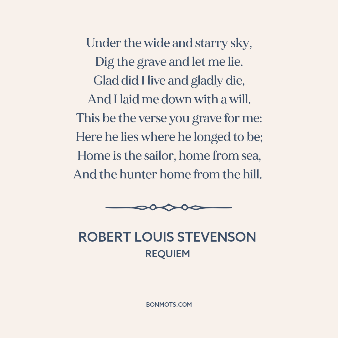 Stevenson, Robert Louis. "Requiem." Underwoods. New York City: Charles Scribner's Sons/London: Chatto & Windus, 1887, I. 1.