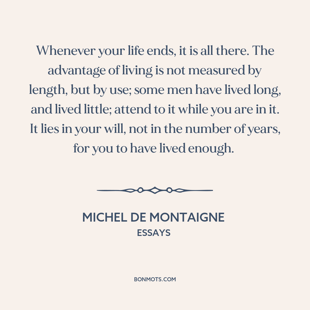 Whenever your life ends, it is all there. The advantage of living is not measured by length, but by use; some men have lived long, and lived little; attend to it while you are in it. It lies in your will, not in the number of years, for you to have lived enough.