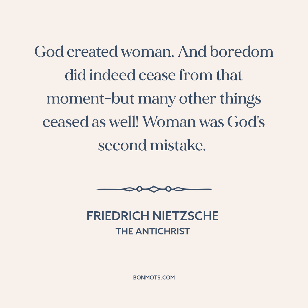 God created woman. And boredom did indeed cease from that moment-but many other things ceased as well! Woman was God's second mistake.