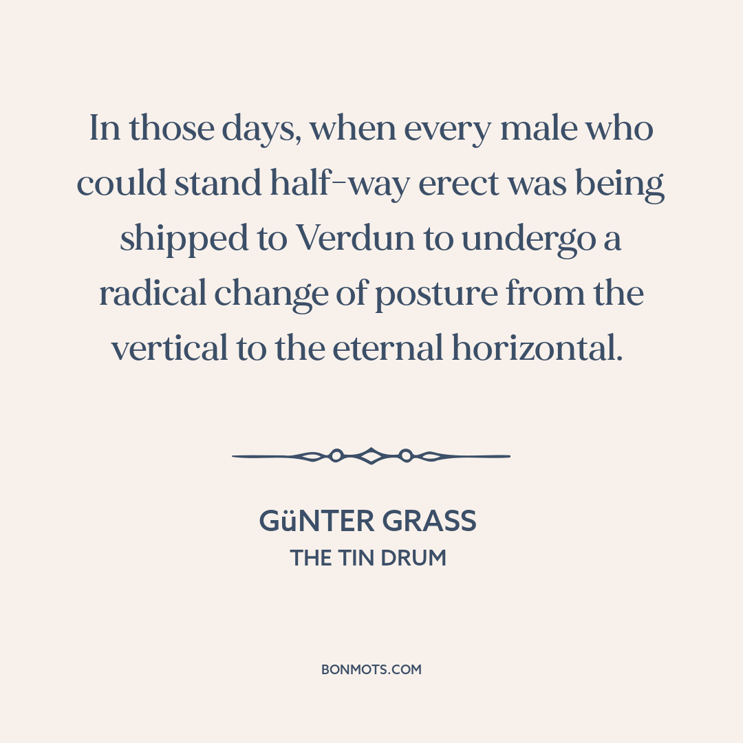 In those days, when every male who could stand half-way erect was being shipped to Verdun to undergo a radical change of posture from the vertical to the eternal horizontal.