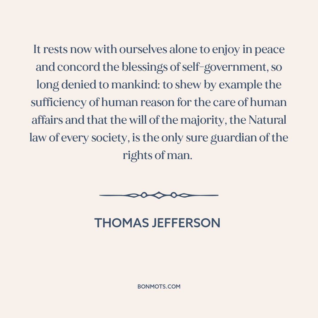 It rests now with ourselves alone to enjoy in peace and concord the blessings of self-government, so long denied to mankind: to shew by example the sufficiency of human reason for the care of human affairs and that the will of the majority, the Natural law of every society, is the only sure guardian of the rights of man.