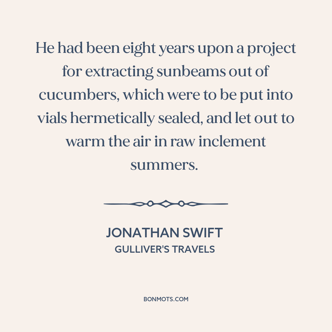 He had been eight years upon a project for extracting sunbeams out of cucumbers, which were to be put into vials hermetically sealed, and let out to warm the air in raw inclement summers.