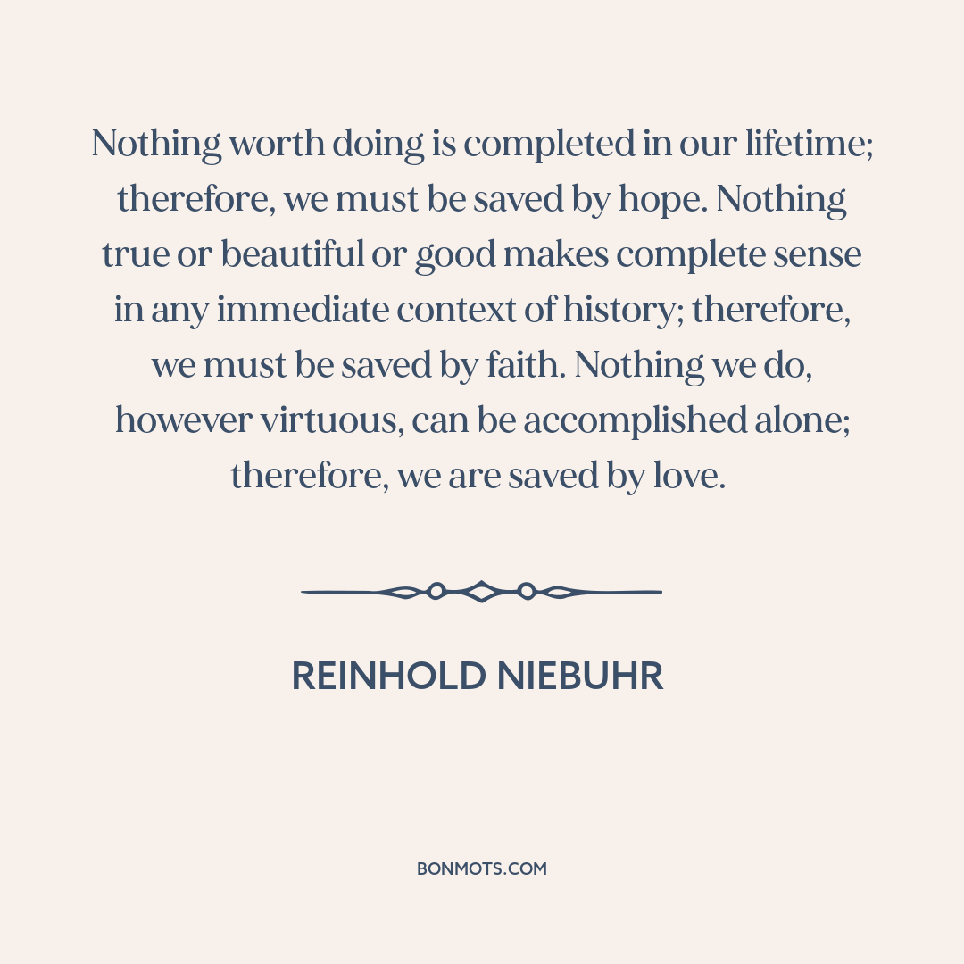 Nothing worth doing is completed in our lifetime; therefore, we must be saved by hope. Nothing true or beautiful or good makes complete sense in any immediate context of history; therefore, we must be saved by faith. Nothing we do, however virtuous, can be accomplished alone; therefore, we are saved by love.