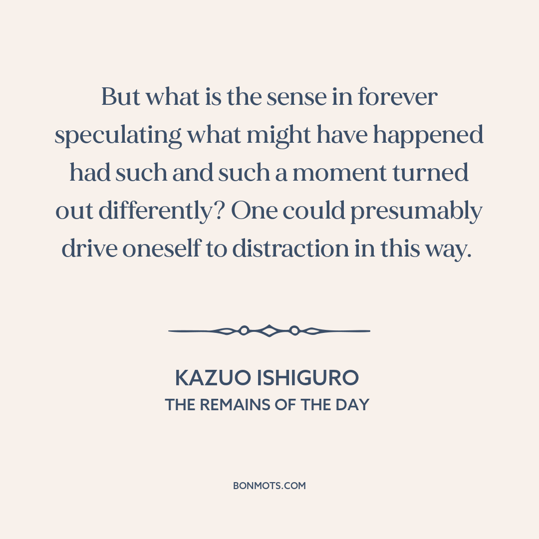 But what is the sense in forever speculating what might have happened had such and such a moment turned out differently? One could presumably drive oneself to distraction in this way.