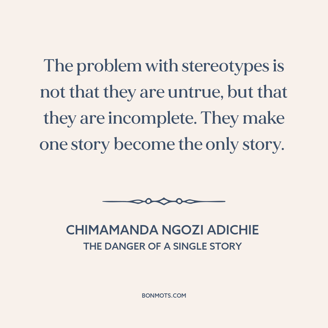 The problem with stereotypes is not that they are untrue, but that they are incomplete. They make one story become the only story.