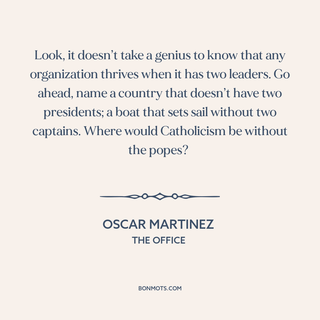 Look, it doesn’t take a genius to know that any organization thrives when it has two leaders. Go ahead, name a country that doesn’t have two presidents; a boat that sets sail without two captains. Where would Catholicism be without the popes?
