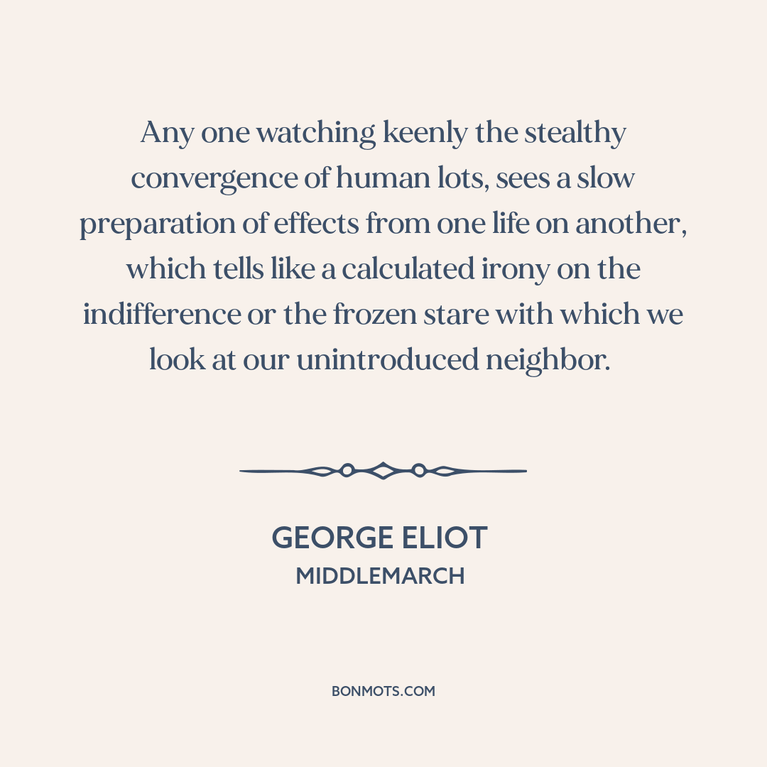 Any one watching keenly the stealthy convergence of human lots, sees a slow preparation of effects from one life on another, which tells like a calculated irony on the indifference or the frozen stare with which we look at our unintroduced neighbor.