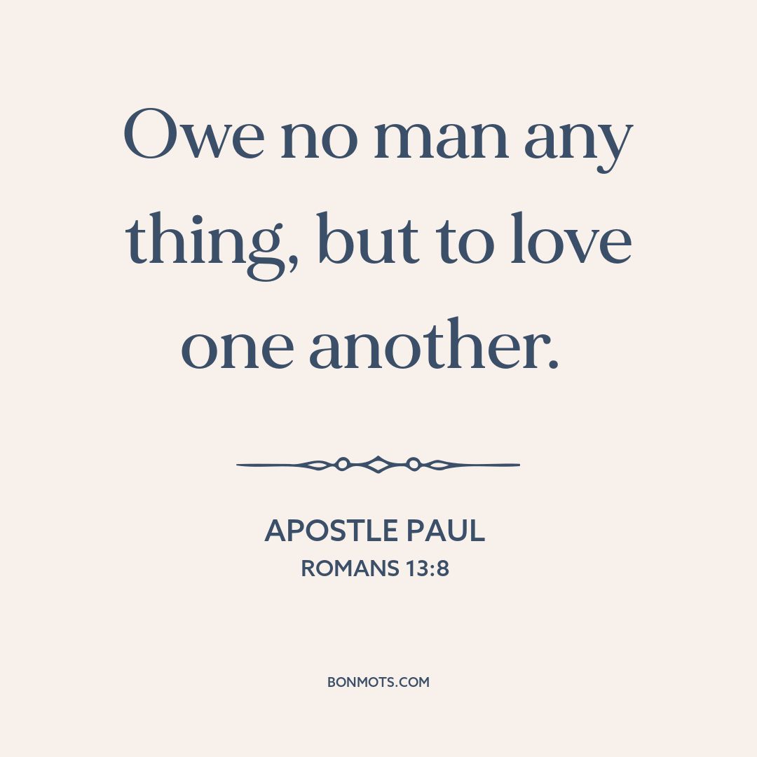 Owe no man any thing, but to love one another. Apostle Paul Romans 13:8 Buy the Bible (KJV) at Amazon Buy the Bible (KJV) at Amazon Read this verse at Bible Hub Instagram sharing coming soon. Quote text and source copied to clipboard. Link to this quote copied to clipboard. More information about this quote Topic Loving others Author Apostle Paul Source Romans The Bible Medium Scripture Genre Religious literature Language Greek Time 56 50s 1st century Era Classical antiquity Occupation Apostle Early Christian Christian From Turkey Europe Roman Empire Authentication Score 3 More information on Authentication Score coming soon. Citation The Holy Bible: The King James Version. 1611. (Romans 13:8). Citation text copied to clipboard.