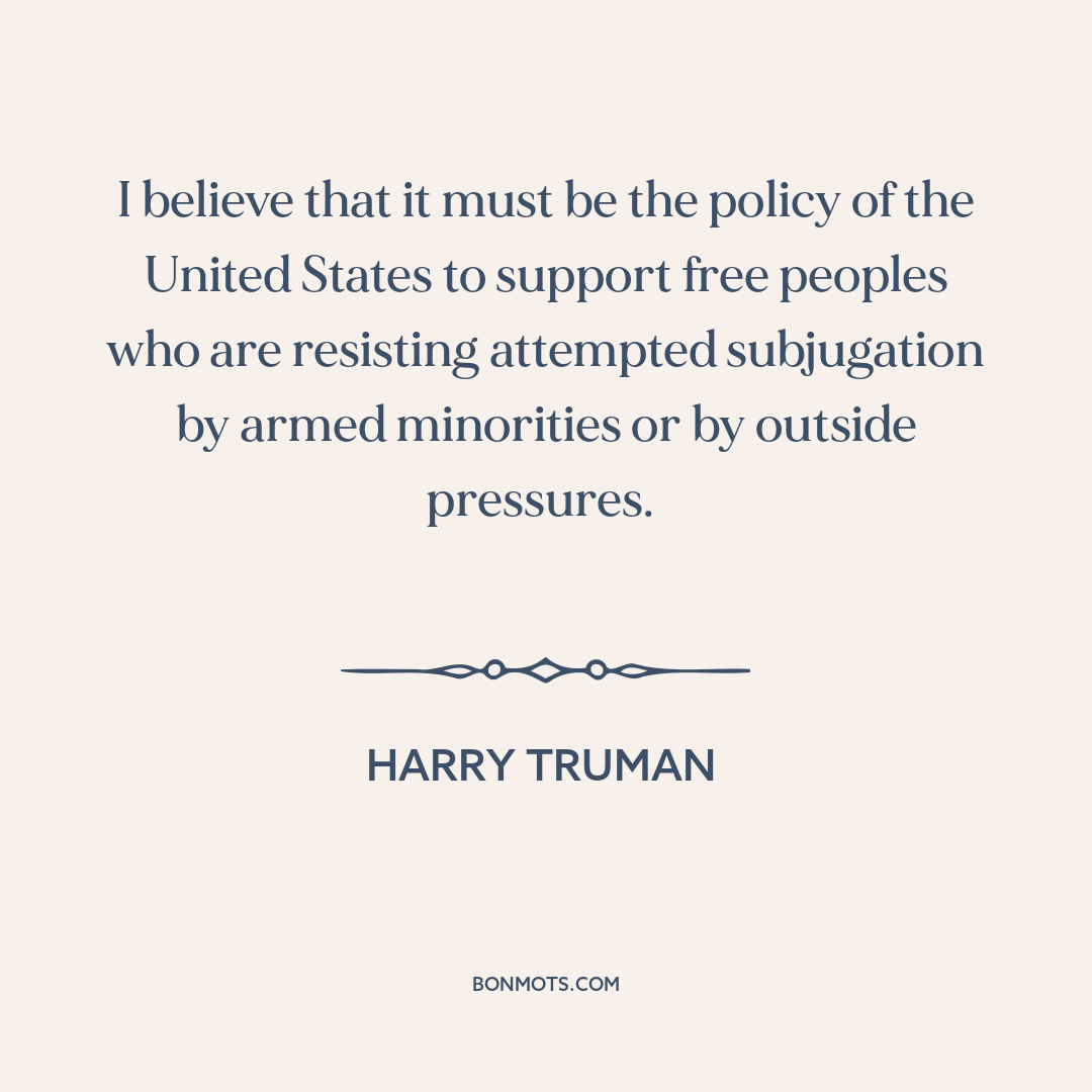 I believe that it must be the policy of the United States to support free peoples who are resisting attempted subjugation by armed minorities or by outside pressures.
