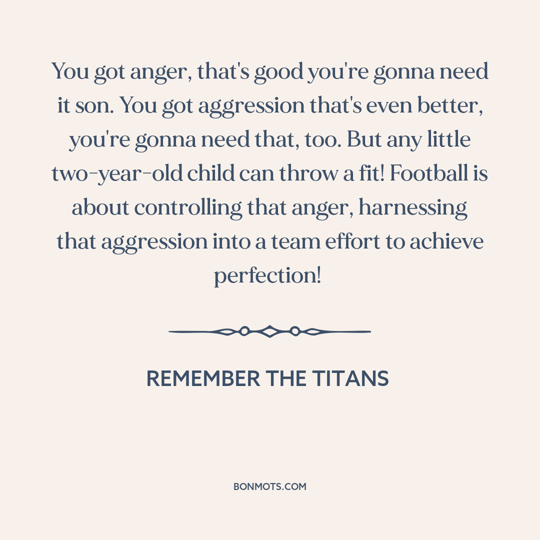 You got anger, that's good you're gonna need it son. You got aggression that's even better, you're gonna need that, too. But any little two-year-old child can throw a fit! Football is about controlling that anger, harnessing that aggression into a team effort to achieve perfection!