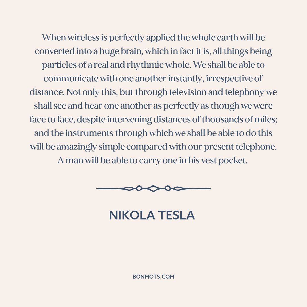 When wireless is perfectly applied the whole earth will be converted into a huge brain, which in fact it is, all things being particles of a real and rhythmic whole. We shall be able to communicate with one another instantly, irrespective of distance. Not only this, but through television and telephony we shall see and hear one another as perfectly as though we were face to face, despite intervening distances of thousands of miles; and the instruments through which we shall be able to do this will be amazingly simple compared with our present telephone. A man will be able to carry one in his vest pocket.