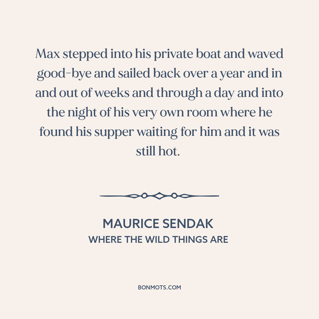 Max stepped into his private boat and waved good-bye and sailed back over a year and in and out of weeks and through a day and into the night of his very own room where he found his supper waiting for him and it was still hot.